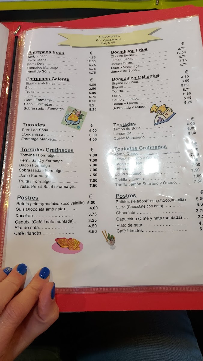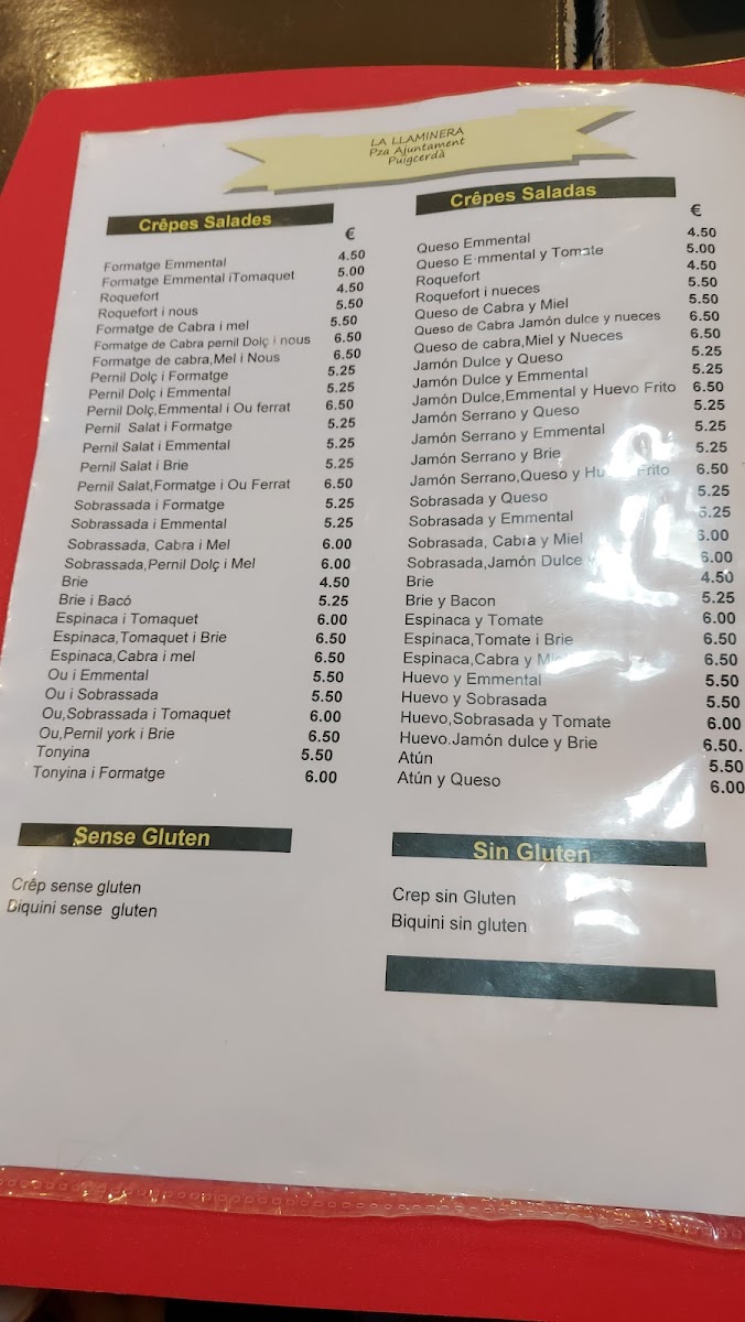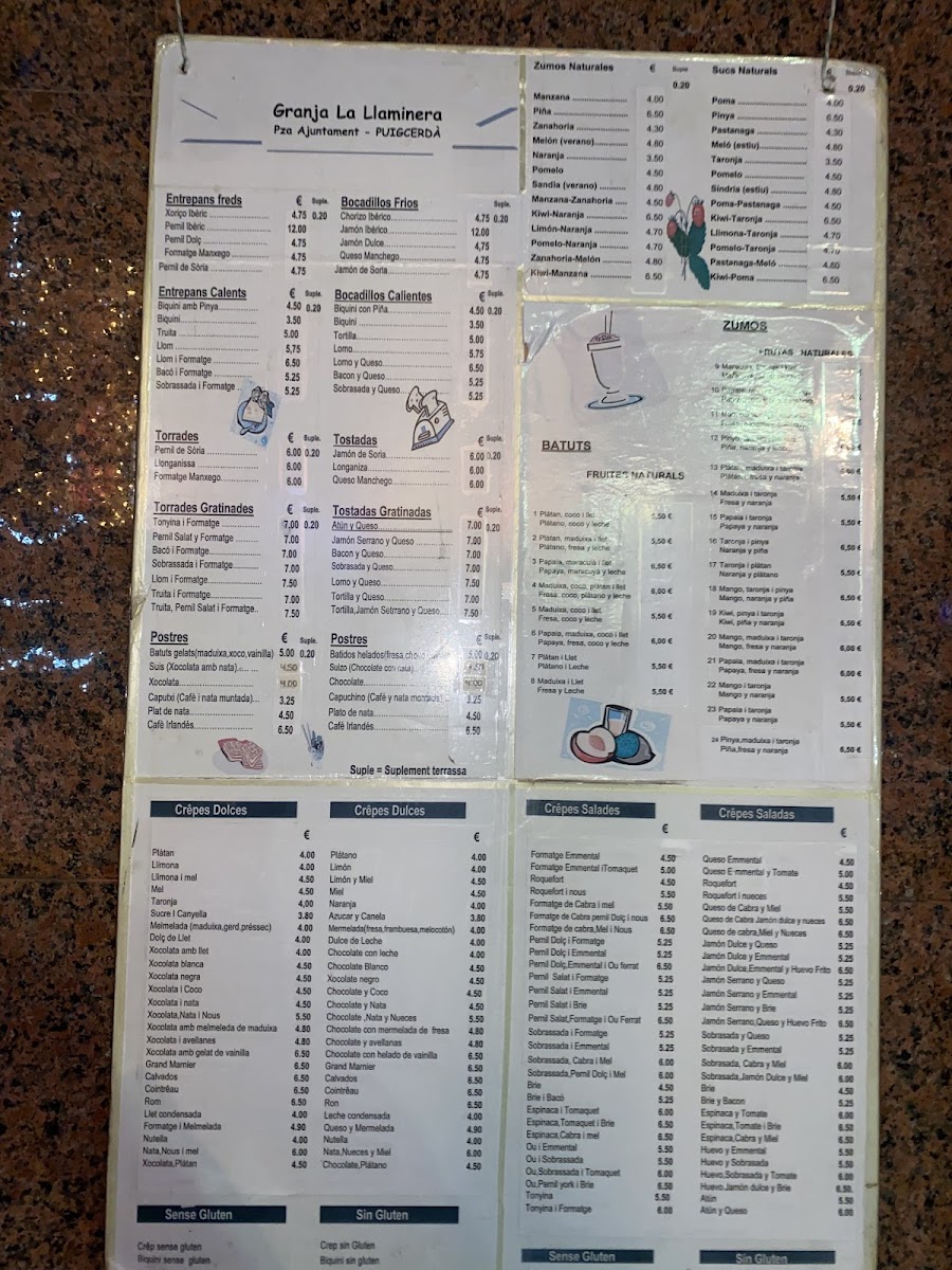 Food options include a variety of crepes featuring ingredients such as Serrano ham, goat cheese, honey, and nuts, as well as sandwiches with fillings like cured ham, sobrassada, and cheese. Light bites such as omelette sandwiches and apple muffins are also available.